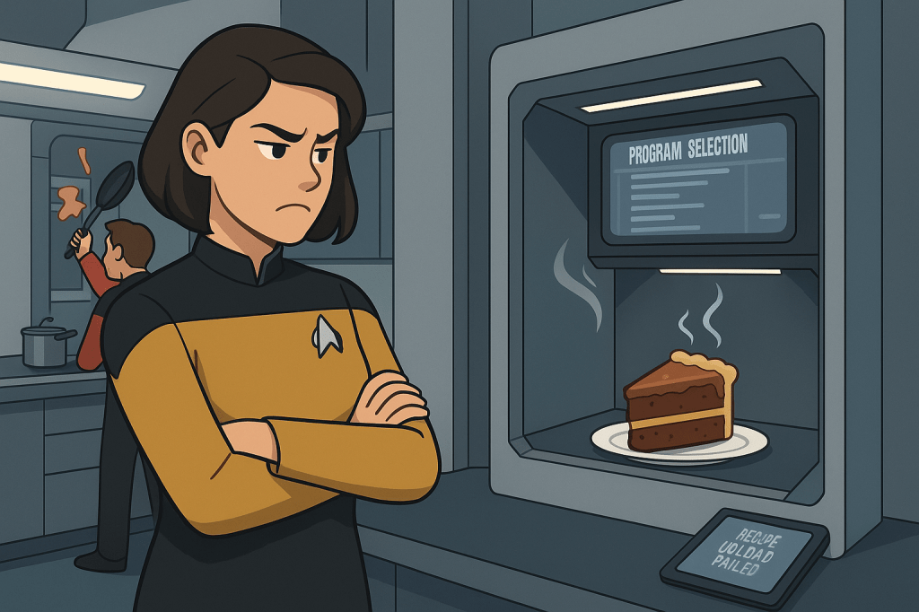 I mean, come on. This is a civilization that can fold space, beam people across hostile terrain, and host full Victorian murder mysteries in the holodeck with better lighting than a BBC costume drama. And yet, when someone wants to add their grandmother’s secret tomato sauce recipe to the replicator, it’s a whole saga. Suddenly you need a molecular biologist, a culinary technician, and probably Counselor Troi to help you process your feelings about spice levels.